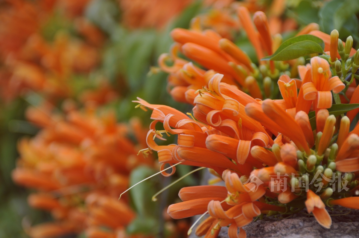 近日,柳州市河东公园的炮仗花迎来盛放,橙红色的花朵如串串鞭炮,密密匝匝地爬满公园石墙,从墙头倾泻而下,形成一面浪漫的橙红色花墙,热烈而醒目,为冬日增添暖色。